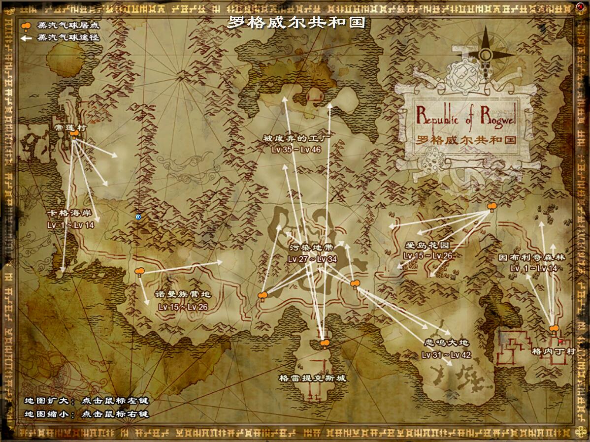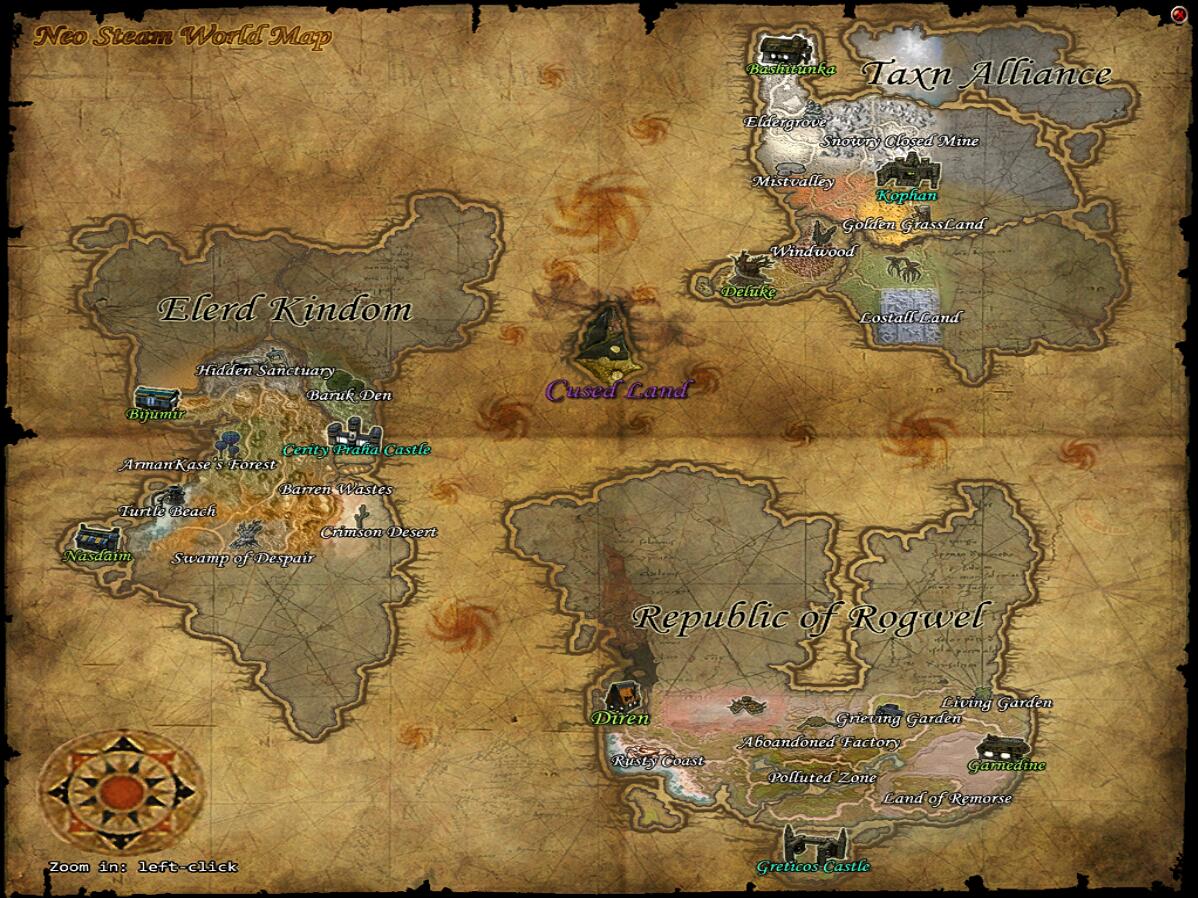 《蒸汽幻想》的游戏世界由三块相邻的大陆组成,分别代表着三个国家。 他们分别是:罗格威尔共和国、艾里沃特王国、塔克沙王国 。